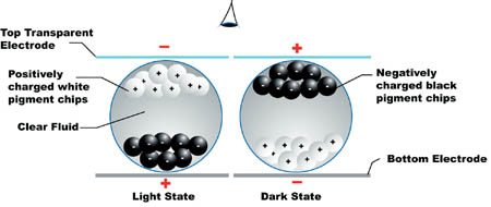 | Свежий номер №17-18 (442-443) / Чертили черными чернилами… Дата публикации: 14.05.2002 Алексей Косарев, alexey-h14@mail.ru Дальнейшему развитию интеллектуальных портативных устройств, таких как мобильные телефоны и PDA (personal digital assistants), все больше мешают недостатки существующих видов дисплеев. В большинстве моделей мобильников и PDA экраны основаны на жидких кристаллах. Со всеми вытекающими последствиями: трудность чтения в широком диапазоне внешнего освещения и чрезмерное энергопотребление. Мало кого радует писк электронного друга: «Умираю - хочу электричества, а ты забыл меня зарядить! Так что звонить придется из автомата!» Возможно, в таких устройствах найдут применение дисплеи на электронных чернилах (electronic-ink displays), предложенные американской фирмой E Ink. Микрокапсулы таких чернил содержат заряженные частицы диоксида титана (чистого белого цвета) и черные частицы с противоположным зарядом. Под действием электрического поля пигмент устанавливается в желаемое положение и окрашивает капсулу в белый, черный или промежуточный серый цвет (см. схему).
