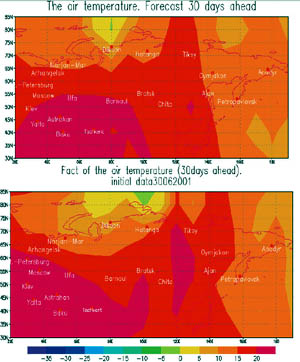 Численный прогноз погоды строится путем решения так называемых полных нелинейных дифференциальных уравнений, которые основываются на трех фундаментальных законах сохранения - массы, количества движения и энергии. Первый из них дает возможность сформулировать уравнения неразрывности и диффузии. Закон сохранения количества движения позволяет записать уравнения движения, а закон сохранения энергии - уравнение притока тепла. При этом учитывается перераспределение энергии путем излучения, конвекции, взаимодействие движущихся частиц воздуха с подстилающей поверхностью, образование облаков и выпадение осадков. Прогнозы погоды обычно подразделяют на краткосрочные (2-72 часа), среднесрочные (3-10 суток) и долгосрочные (месячные и сезонные прогнозы). Такое деление не является формальным, а связано с физическими особенностями атмосферных процессов. Если движение воздушных масс определяется в основном собственной динамикой атмосферы, то прогнозы считаются краткосрочными. Если же оно зависит от медленно меняющихся граничных условий (например, температуры поверхности океана), то мы имеем дело с долгосрочным прогнозом. Среднесрочный прогноз занимает промежуточное положение: движение воздуха зависит как от начальных состояний атмосферы, так и от граничных условий. Для успешного решения поставленных задач требуются различные численные модели, которые отличаются друг от друга набором учитываемых физических процессов, играющих доминантную роль. Гидрометеорологический центр России является одним из трех мировых центров (Москва, Вашингтон, Мельбурн), имеющих иерархию численных моделей, различных по масштабу воспроизводимых явлений. Глобальная модель представляет атмосферные процессы на всем земном шаре при прогнозе до 7-10 суток; региональная более подробно рассматривает метеорологические процессы на территории Европы и России с заблаговременностью до двух суток; мезомасштабная модель предназначена для детального отображения метеорологических явлений в районе Москвы и Московской области в пределах суток. Глобальная модель атмосферы основана на системе уравнений гидротермодинамики бароклинной атмосферы 1, для решения которой используется спектральный подход. В модель атмосферных движений включены описания таких физических механизмов как перенос радиации, турбулентность в пограничном слое и в свободной атмосфере, обмен теплом, влагой и импульсом с подстилающей поверхностью суши и с океаном, фазовые превращения влаги в атмосфере и др. В 1997 году модель была реализована на суперкомпьютере Cray, в конфигурации «T40L15-Северное полушарие» (это соответствует шагу широтно-долготной сетки 2,8° на пятнадцати атмосферных уровнях), а в 1999 году - в конфигурации «T85L31-Глобус» (шаг 1,4° на тридцати одном уровне). Модель ежедневно предвычисляет метеорологические поля в толще атмосферы до высоты 30 км с заблаговременностью до десяти суток. Прототипом этой разработки послужила спектральная модель Европейского центра среднесрочных прогнозов погоды, которая по своим прогностическим характеристикам заметно превосходила другие аналоги. Региональная модель с высоким пространственным разрешением была разработана в Гидрометцентре России в 1998 году. В ней учитываются фазовые переходы влаги (рассчитываются осадки за семь шестичасовых срок