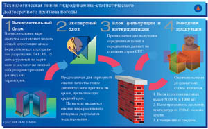 На комплексе реализована схема гидродинамико-статистического долгосрочного прогноза метеорологических элементов. Ее вычислительное ядро составляют модель общей циркуляции атмосферы, имеющая спектральное разрешение Т41 (пространственное разрешение примерно 250-300 км), пятнадцать сигма-уровней по вертикали и достаточно полный набор параметризаций физических процессов. Экспертный блок предназначен для априорной оценки качества гидродинамического прогноза и определения интервала его практической полезности. Блок фильтрации и интерпретации позволяет получить (на основе статистической обработки результатов численного моделирования) осредненные значения метеорологических параметров для станций, расположенных на территории СНГ. Выходной продукцией являются осредненные по времени поля геопотенциальных высот, поле приземного давления воздуха, поля температуры, а также станционные средние значения приземной температуры воздуха и осадков. Интервалами осреднения являются десять, двадцать и тридцать дней.