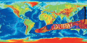 Два важных события способствовали становлению гипотезы перемещения террейнов. Первое случилось на просторах Южной Атлантики, где два француза, Дюпре и Аллегре, изучали современный базальтовый вулканизм океанических островов. Оказалось, что многие базальтовые серии этих островов образованы за счет плавления весьма специфической по составу мантии. Дальнейшие работы показали, что зона излияний базальтов аномального состава тянется по крайней мере через половину южного полушария между 20-й и 40-й параллелью (см. рисунок). Существование здесь мантийной аномалии очень глубокого залегания было подтверждено сейсмической томографией и данными трехмерного моделирования земной поверхности. Она получила название аномалии DUPAL (от фамилий DUPre и ALlegre). Резонно было предположить, что необычные особенности базальтов из офиолитовых фрагментов северо-востока России объясняются их выплавлением из вещества, подобного мантии DUPAL, - хотя бы потому, что все прочие объяснения, в силу ряда причин, удовлетворительными не были. Однако доказать или проверить это не представлялось возможным. Выделение базальтовых серий, связанных с аномалией DUPAL, основывалось в первую очередь на данных геохимии стабильных изотопов. Изотопные же И тут произошло второе из упомянутых событий - появление (разумеется, в России, не в мире) первых персоналок.Это были произведения широко известной тогда фирмы Amstrad - о процессоре Intel 8086 с тактовой частотой аж 8 МГц, о 640K ОЗУ, с огромными винчестерами (30 Мбайт) и прочей крутизной, работающей, разумеется, под MS-DOS версии 3.3. Вот на них-то и началось масштабное сравнение геохимии базальтов из зоны DUPAL с базальтами офиолитов Северо-востока (благо данных традиционной геохимии за десять лет накопилось вдоволь). Делалось это посредством полузабытого ныне табличного процессора QuattroPro. Сначала были установлены геохимические индикаторы (отношения элементов с противоположным поведением при процессах плавления) в базальтах, для которых было доказано происхождение из аномальной DUPAL-мантии. Затем та же методика применялась для базальтов Северо-востока. В результате чего последние по межэлементным отношениям статистически значимо распались на две серии - с DUPAL-характеристиками и без оных. Причем их положение было геологически различно: первые ассоциировались с тепловодной фауной и не были связаны с геологическими структурами Северо-востока, вторые такой ассоциации не имели, зато обнаруживали связь со структурами зоны перехода от Северной Пацифики к Евразии, что и дало основание предположить их «заморское» происхождение.