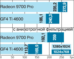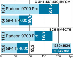 Подчеркну, что в 3DMark тестируются вершинные шейдеры версии 1.1, пиксельные шейдеры версий 1.1 - в Pixel Shader Test, а в Advanced Pixel Shader Test наш герой использует продвинутую версию 1.4 (GeForce4 Ti, незнакомый с нею, «мучается» все с той же 1.1 и в этом тесте). Как R300 обрабатывает шейдеры 2.0, мы, к сожалению, не знаем. В игровых приложениях приведу результаты из поразительно живучего в качестве бенчмарка «Quake 3: Arena» (OpenGL, см. первый блок диаграмм.). Эта игра снова показывает потрясающую масштабируемость (все тесты проводились при 32-битной глубине цвета). Затем включим анизотропную фильтрацию. Для того чтобы карты находились в сходных условиях, оба конкурента использовали восемь трилинейных сэмплов. Диаграммы наглядно показывают преимущество R300. При включении анизотропной фильтрации, когда влияние центрального процессора на общий результат снижается, Radeon 9700 заметно опережает GeForce4 Ti 4600. Более того, его результаты при этом даже несколько выше, чем у чипа Nvidia при стандартных настройках! Перейдем к антиалиасингу (второй блок диаграмм). Обе карты используют режим 4х. И здесь похожая картина - почти двукратное преимущество за ATI. Наконец, посмотрим на результаты при экстремальных настройках - мы заставили ускорители совместить анизотропную фильтрацию и антиалиасинг. Результат вполне предсказуем и в комментариях не нуждается - цифры говорят сами за себя. Подробный отчет о других тестах читайте в материале на сайте Ferra.ru.The End. Happy End Radeon 9700 удался. Помимо рассмотренного варианта Pro, свет увидят просто Radeon 9700, Radeon 9500 Pro и Radeon 9500. Первый полностью идентичен «нашему», но работает на пониженных (вернее, это у Pro они завышены) частотах - 275МГц/ 270МГц DDR. В версии 9500 Pro по сравнению с 9700 (обычным) шина памяти урезана до 128 бит, и максимальный объем локальной памяти сокращен до 128 Мбайт против 256. Но в остальном - все то же самое. А вот в стандартном Radeon 9500 в «дополнение» вырезали половину пиксельных конвейеров (осталось четыре), при этом оставив только один текстурник на каждом, «плюс» максимальный объем локальной памяти сократили до 64 Мбайт. Впрочем, поддержка DirectX 9 сохранилась во всех вариантах. Как видите, нам предоставили весьма широкий выбор. Осталось только не забыть, что где. Все это должно внушать оптимизм поклонникам канадской компании. На данный момент она, несомненно, правит на графическом рынке. Но все же на душе у боссов ATI неспокойно. Темной тучей висит над ними NV30 - оглашенные характеристики GeForce FX не предвещают ничего хорошего для ATI. Разразится гроза или все ограничится легким дождиком, мы пока не знаем. В продаже конкурент появится, судя по всему, не ранее февраля следующего года. До этого момента у ATI есть время подготовить ответный удар на еще не состоявшийся, по сути, вызов нынешнему лидерству. Какой вариант выберет руководство компании? Наиболее простой в реализации ценовой? Или изыщет возможности для «драйверного» ответа, как это ранее делала Nvidia? Или же успеет внедрить 0,13-мкм техпроцесс с последующим увеличением рабочей частоты? А может быть, все сразу? Или не надо будет что-то предпринимать вообще (кто знает, как себя покажет в деле NV30)? Нам остается только гадать и ждать сражения, которое обещает стать самым серьезным за всю историю противостояния ATI и Nvidia.