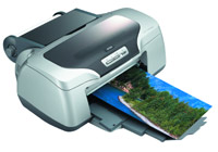 Outstanding quality and durability with Epson. Позвольте это не переводить и просто отнести на счет R800 как достойного представителя японской техники (помните, двадцать лет назад мы не вдумывались в марки заморских магнитофонов: Sanyo, Sharp, Technics подразумевали одно и то же выдающееся качество — японское). Конструкция — не дизайн! — этого принтера, в общем-то, типична для струйных линеек Epson последних лет: верхняя подача для отдельных листов, рулонная подача для отрезных носителей, печать без полей на бумаге практически любых (до А4) размеров, сквозной тракт для печати на жестких носителях, в том числе и на компакт-дисках. Подающий и приемный лотки доведены до совершенства: оба убираются заподлицо с основным объемом корпуса, причем верхний образует полезную горизонтальную поверхность (которую лично я тут же охотно чем-нибудь захламлял). Важная черта дорогого продуманного до мелочей прибора — встроенный блок питания, с прямым подключением сетевого кабеля. Уместно сказать здесь и о том, что механизм при подаче бумаги и печати работает необычайно тихо; принтер напоминает о своем присутствии, только когда принимает в работу новую чернильницу или вообще обслуживает головку. Наконец, я был искренне удивлен, что перерыв в работе более чем на месяц никак не сказался на чистоте дюз печатной головки — очевидно, былые болячки Epson искоренила со всей серьезностью, и отныне самый дорогой элемент принтера надежен настолько, чтобы об этом больше не заикаться.