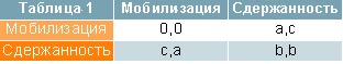 Проблемы конфликтов и сотрудничества (с позиций теории игр) живо интересуют израильтянина Роберта Ауманна (Robert J. Aumann [1]) и американца Томаса Шеллинга (Thomas C. Schelling [2]), разделивших в этом году Нобелевскую премию по экономике. Ведь войны, агрессия, страх, насилие - это то, что разрушает экономики и делает жизнь человека "одинокой, бедной, отвратительной, зверской и короткой" (Томас Гоббс). Вклад социолога Шеллинга тесно связан с развитием теории ядерного сдерживания. Он анализирует переговоры - не только в их классическом виде, но и когда, по словам ученого, "два грузовика с динамитом встречаются на дороге, достаточно широкой лишь для одного". Вот краткая иллюстрация его теории. Возьмем два государства, предъявляющих друг к другу территориальные претензии. Их противостояние имеет две ступени эскалации: военную мобилизацию и начало реальных боевых действий. Взаимная мобилизация ведет к высокой вероятности войны и служит нулевой точкой отсчета в оценке последствий того или иного разрешения ситуации. Приобретения и потери агрессора (a) и жертвы (c), прелести взаимного миролюбия (b) образуют матрицу (табл. 1), в которой одна из сторон выбирает себе строку, а другая - столбец.