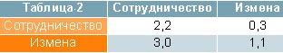 Математик Ауманн проанализировал проблемы долгосрочной кооперации. Простейшая иллюстрация - игра "дилемма заключенных" ("сознаться и выйти на свободу"), в которой матрица выгод выглядит примерно так (табл. 2). Ауманн показывает, что если в краткосрочном плане выигрывает "изменщик", то при постоянном повторении игры выгодно установление сотрудничества. Но это лишь пример, выводы Ауманна относительно стратегии игр с ненулевой суммой (где все сразу могут выиграть или проиграть) носят гораздо более обширный и глубокий характер.